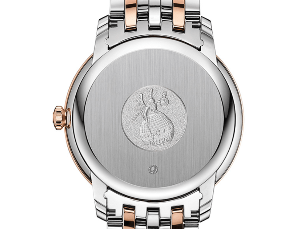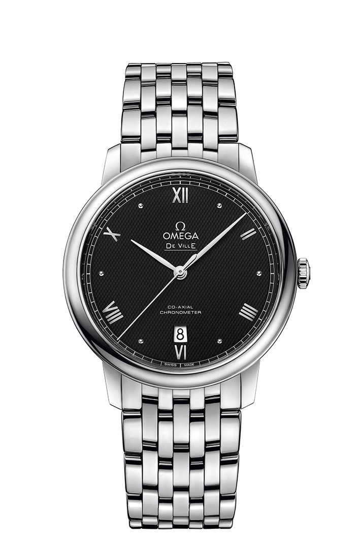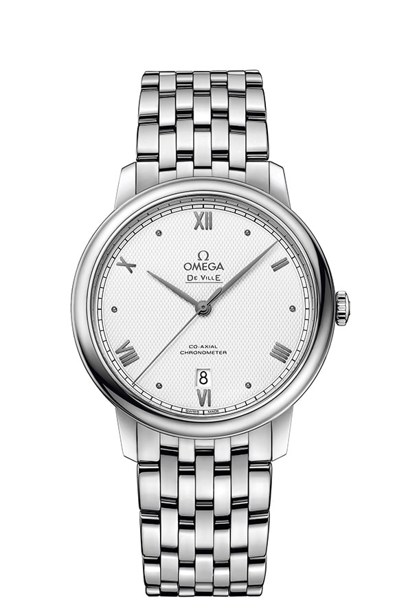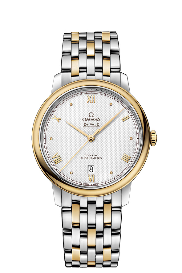 全新葉形時針與分針以及6點鐘日期視窗進一步襯托面盤,39.50毫米錶殼備有不鏽鋼、不鏽鋼與18K黃金,以及不鏽鋼與18K玫瑰金款式。每個款式的底蓋飾有歐米茄碟飛Prestige系列的代表性浮雕:時間之神克羅諾斯。最後,Prestige手錶必會配備其獨特錶鍊,而此種錶鍊的特色就是充滿精緻風格並帶來佩戴舒適性的交錯拋光鍊節。