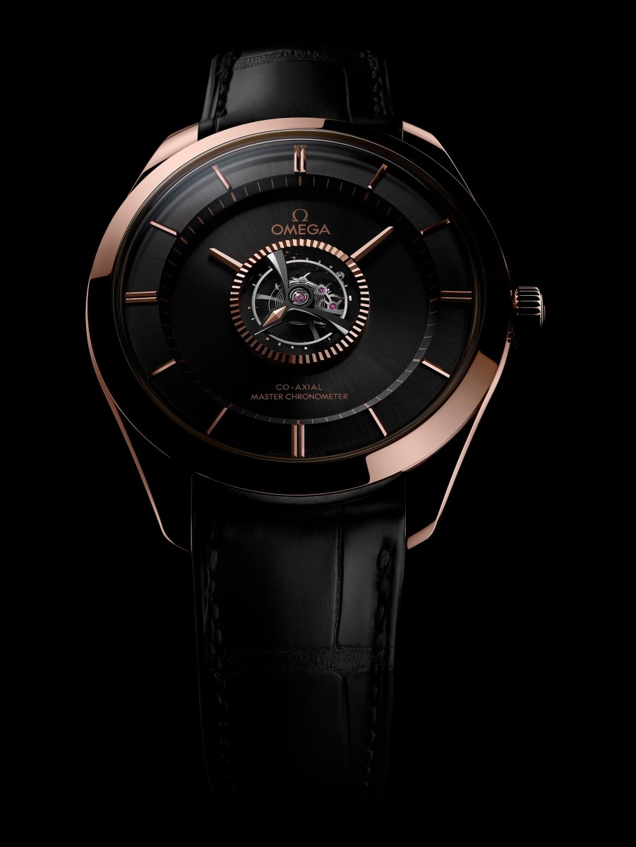 全新碟飛陀飛輪的設計出眾,整合了歐米茄的製錶專業與先進材質,包括兩種著名的歐米茄貴重合金。在黑色皮革錶帶上,43毫米錶身、錶扣商標與錶冠商標皆採18K Canopus™金——這種獨家白金合金與眾不同之處在於更加光亮、潔白與耐久。而此錶的錶耳、錶圈與底蓋則是以歐米茄旗下鮮明玫瑰金合金18K Sedna™金打造而成。在面盤中央令人絕對不會錯過的是略微傾斜、經手工拋光的黑色陶瓷鈦金屬陀飛輪框架。這個巧妙裝置驅動獨特與神祕的指針,賦予這款手錶無與倫比的歐米茄風格。