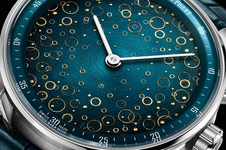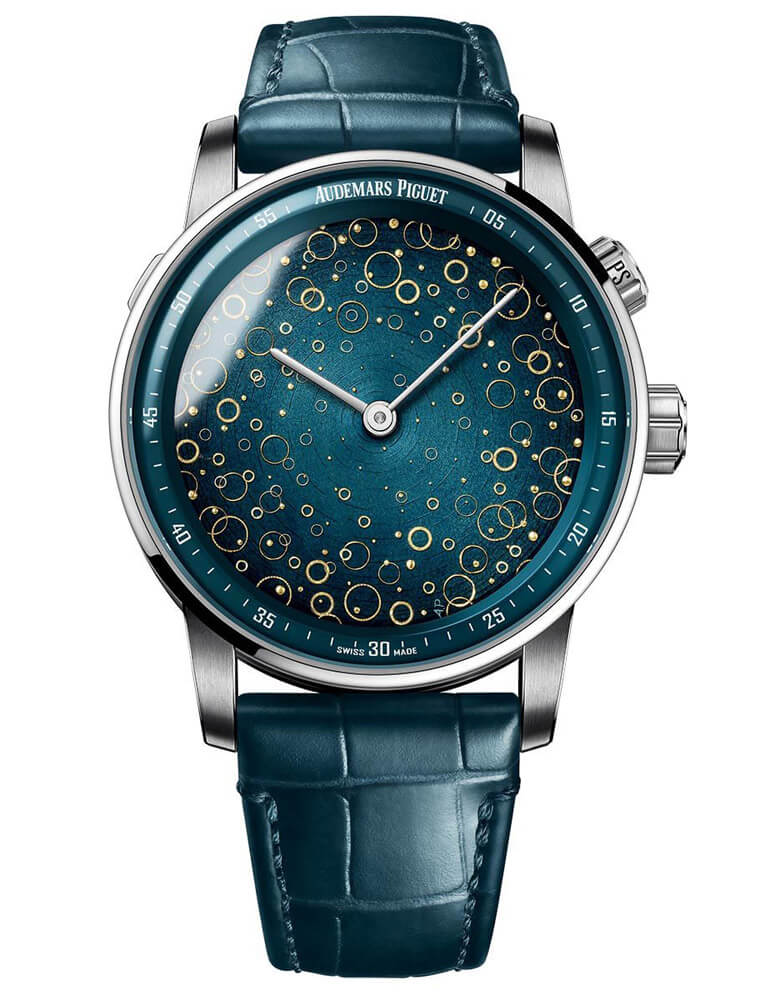 其實CODE 11.59超問錶採用煙燻藍色琺瑯面盤的製作過程已屬不易,不過CODE 11.59大自鳴鐘樂超問錶可是愛彼特別邀請到琺瑯工藝裡超級有名的大師——Anita Porchet操刀製作,讓她以大明火金片琺瑯技法自由發揮創作出三款獨一無二的面盤樣式,Anita筆下的琺瑯畫作就像藝術品一樣廣受市場與專業人士推崇,有她加持的琺瑯錶猶如瞬間晉升另一種收藏境界般稀有珍貴,因此愛彼刻意減少面盤上的顯時功能,為的就是要讓Anita能夠不受拘束地發揮她的匠心才氣。值得一提的是,CODE 11.59大自鳴鐘樂超問錶限量數其實有5只,但是Anita只創作了3種面盤,剩下的「扣達」似乎可以提供錶主客製化面盤,再交由Anita Porchet工作室替錶主完成舉世無雙的專屬面盤。