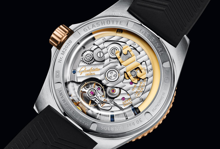 過往我們會認為採用實底蓋有助於鞏固腕錶的防水性能,然而近代製錶科技不斷進步,如今即使是達到ISO專業潛水錶標準的作品也不乏換成透明底蓋的作品了——包括SeaQ 大日期潛水錶便是一例;有意思的是,搭配透明底蓋的SeaQ 大日期潛水(防水300米)防水性能反而在裝配實底蓋的SeaQ 1969和SeaQ(防水200米)之上,這點或許和後者較強調與古董錶的復古氛圍有關。SeaQ 大日期潛水錶的透明底蓋下方為格拉蘇蒂原創自製36-13自動機芯,鏤空自動盤不僅可見象徵品牌的雙G Logo,其邊緣也特別用是K金材質來強化機芯的上鍊效率,另外機芯零件的格拉蘇蒂菱紋、倒角、拋光乃至鵝頸式微調等都蘊含精工細作的高級腕錶風範。如同腕錶外在集強悍與優雅個性於一身,作工細緻迷人的36-13機芯也必須通過格拉蘇蒂原創原廠長達24天的自我檢測關卡後才能推出市面,其中包含模擬人手佩戴情境以及6方位調校,並確保機芯走時動能至少有100小時的充裕水準,簡言之其以超過天文台認證等級的規格,展現高端潛水錶令人信賴的優異品質。