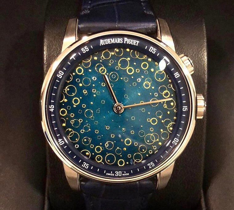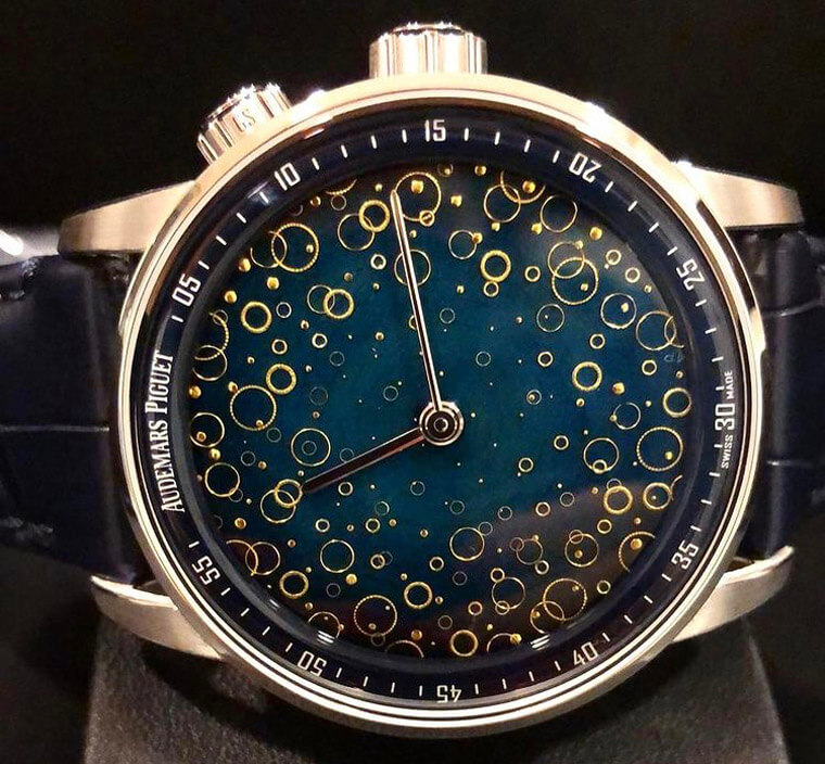 僅僅限量5只的CODE 11.59大自鳴鐘樂超問錶外觀看起來簡約,但是目前已經曝光的3款每款設計都有各別變化,重點是它們都是出自錶壇超級有名的琺瑯大師Anita Porchet之手,Anita本次替AP這款年度代表作應用大明火金片琺瑯工藝來進行創作,以藍綠色琺瑯為基底的面盤出現來不同形式的金片作為點綴,例如圓點或是縱橫交錯的線條等等。讓手錶看起來賞心悅目,也無形中提升了它的收藏價值以及藝術美感。