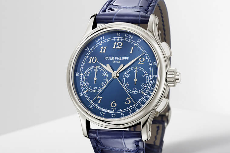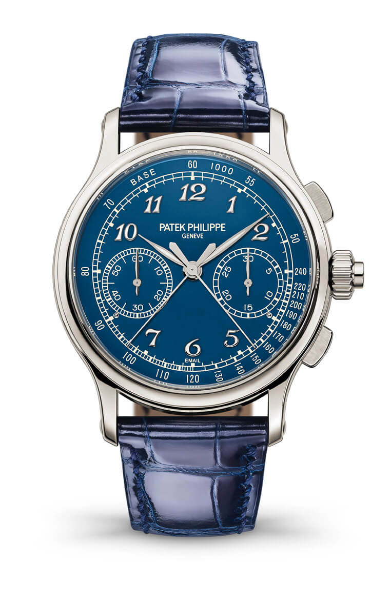錶款的藍色琺瑯面展現出濃淡度剛好的藍色調,這是由製錶師在尺寸極有限的18K金面盤上細心調色、燒製後所得到的成果。百達翡麗在琺瑯面上印上白色的刻度,包括面盤外圍的測速計刻度、兩枚小錶盤的小秒以及30分鐘計時刻度等,至於手錶的葉形時、分指針與寶璣式阿拉伯數字時標則都是以白金材質製成,與琺瑯面既有對比效果,且與刻度間又有高低的立體層次,讓時間顯示非常清晰易讀。