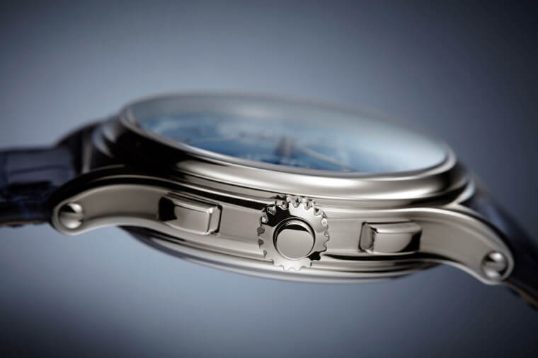 百達翡麗Grand Complications系列的5370P是品牌目前唯一一款具備純粹追針功能的作品。而在原本的黑色琺瑯面盤問世一段時間後,前幾年百達翡麗透過推出改款的機會,一方面讓藍面款接棒,同時也停產黑色面盤款式。這款5370P一如上一代黑面都是採用鉑金錶殼,這點從錶殼6點方向細心鑲嵌上一顆鑽石可以間接證明,另外手錶這次搭配能呼應面盤顏色的深藍色鱷魚皮錶帶,這是隨著面盤配色更新所一併做出的調整動作。