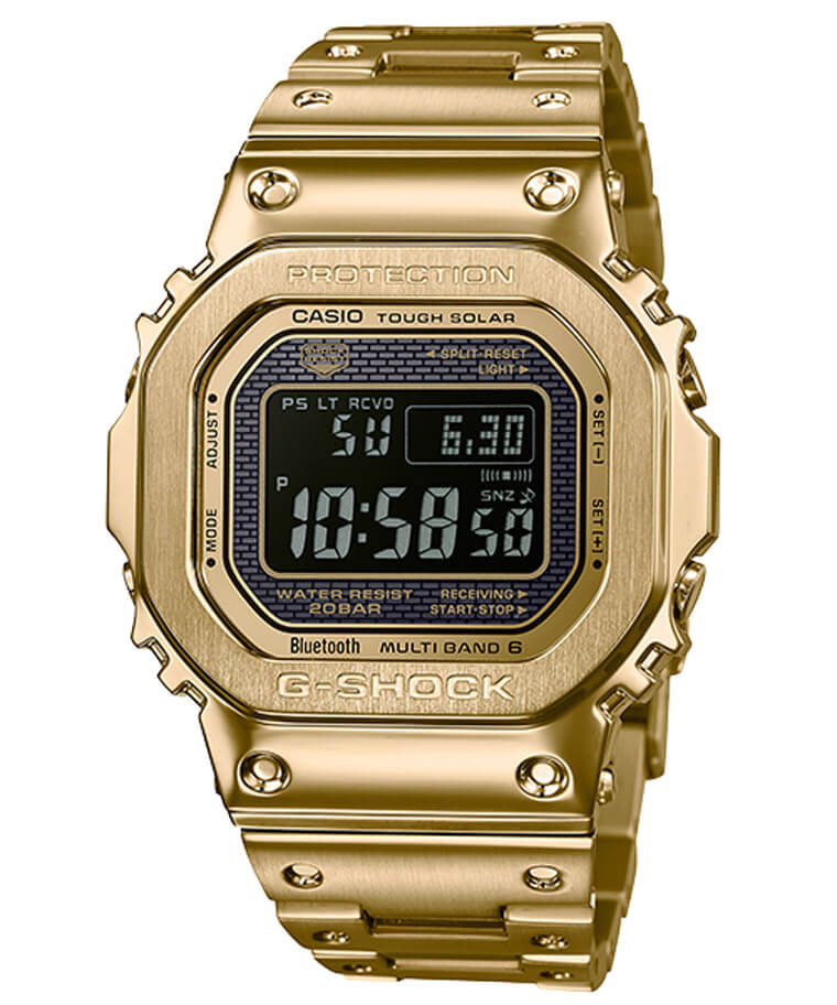 近年G-SHOCK最受歡迎的金錶非GMW-B5000GD-9JF莫屬,雖然品牌過往也曾出過整只鍍金色的樹脂錶殼手錶,不過這款卻是用真正的金屬打造錶殼,質感比起樹脂要更上層樓。自2018年問世後便受到市場高度關注,GMW-B5000GD-9JF以品牌經典DW-5000為藍本,結合自動充電的Tough Solar太陽能電力系統並首次採用淡入/淡出效果的高亮度全自動LED照明,同時還有Bluetooth®藍牙連線功能及世界六局標準電波,可以和佩戴者的手機進行連線同步調校手錶的時間資訊,至於G-SHOCK電子錶標配的各種功能它也一樣不缺。
