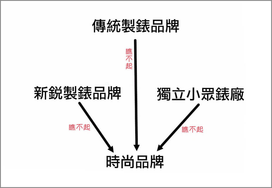 而在不同的手錶品牌派別中,則是可以分成傳統製錶、新銳製錶和獨立小眾錶廠以及時尚品牌手錶等四種,他們之間存在的關係比較微妙,前三者算是互看不順眼,但是對於時尚品牌手錶,前三者卻又都是有志一同的看不上眼,因此形成了以下的關係圖: