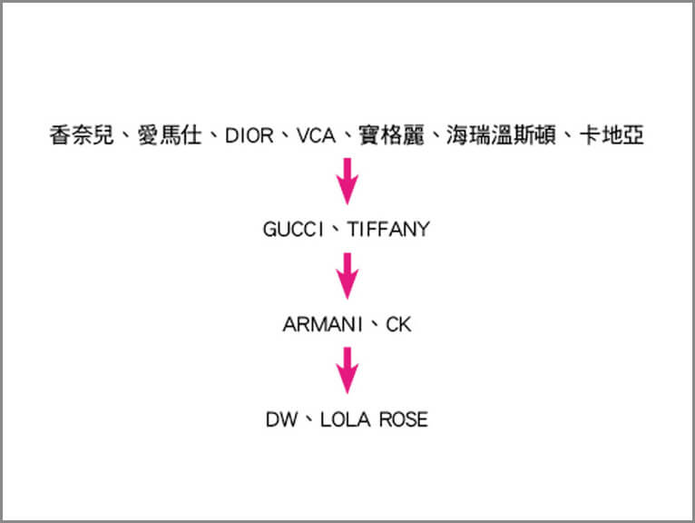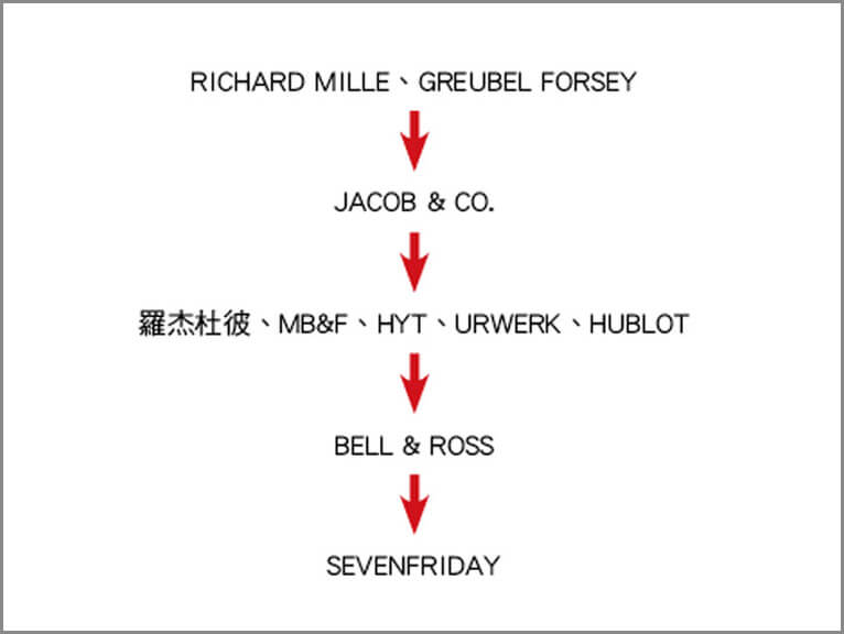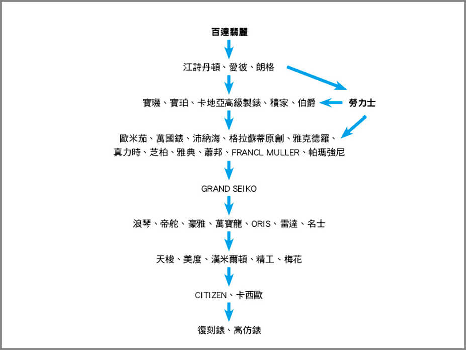 再來這位錶友又按照四大品牌派別分別列出他們的階層食物鏈圖表,以下就來個別看看這些派別的食物鏈長怎樣(箭頭表示位在食物鏈的較上層):
