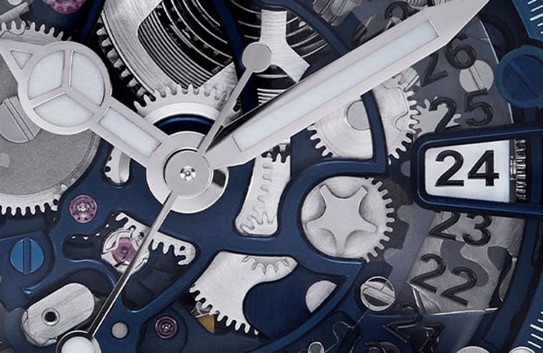原本Deepsea的黑色陶瓷錶圈也同步換成深藍色調,與機芯零件、面盤外緣刻度環的藍色深淺有別,強化手錶藍色系的視覺層次效果。Source:Artisans de Genève