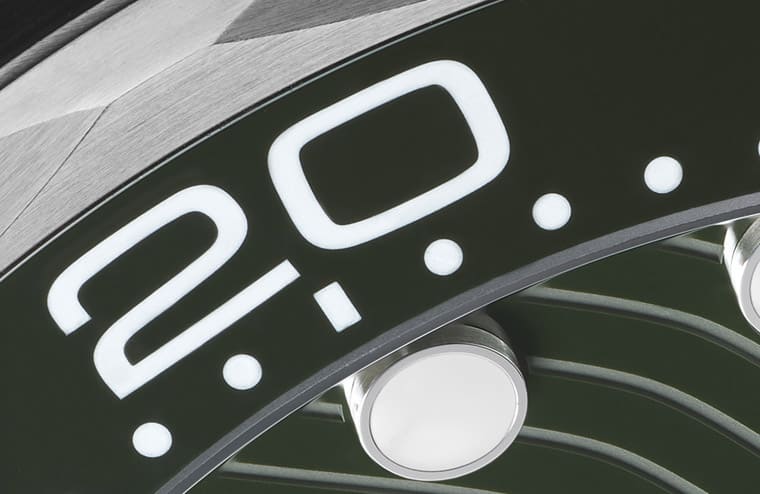 綠水鬼的錶圈刻度填的是鉑金,至於海馬潛水300米則是填白色琺瑯為主,以對比效果而言,綠海馬的白色琺瑯刻度放在深綠色陶瓷錶圈上看起來非常清晰,而且琺瑯不會有褪色疑慮,戴久後光澤還是一樣明豔。