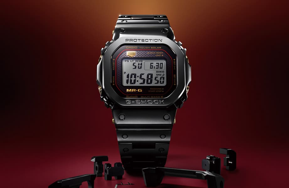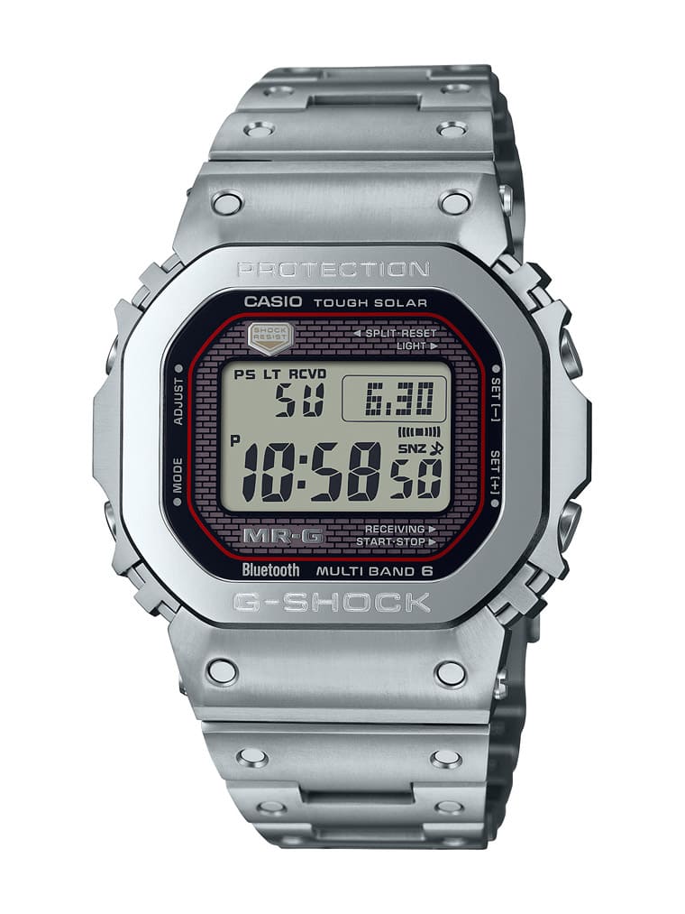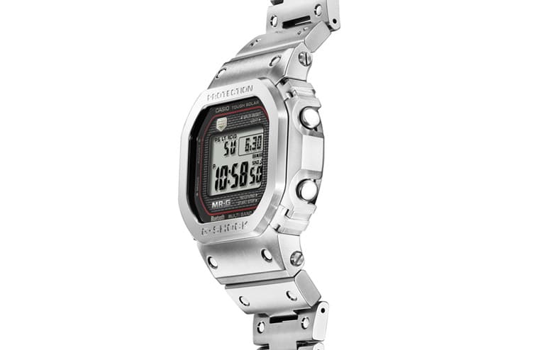 MRG-B5000將原本一體成型的錶圈設計,改由25枚不同零件重新組合而成,並對每枚零件進行拋光處理,此外為了還原DW-5000C的鍊帶特色,品牌還在每個金屬鍊節的圓孔中嵌入獨立針腳,以便對錶帶進行更細緻的拋光處理。MRG-B5000透過多重零件組合出全新耐衝擊構造,在手錶的2、4、8、10點鐘方向的T形零件內,加入彈簧墊片吸收衝擊,確保手錶的抗震性依舊出色甚至更上層樓。