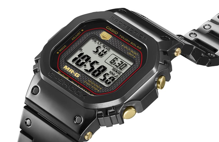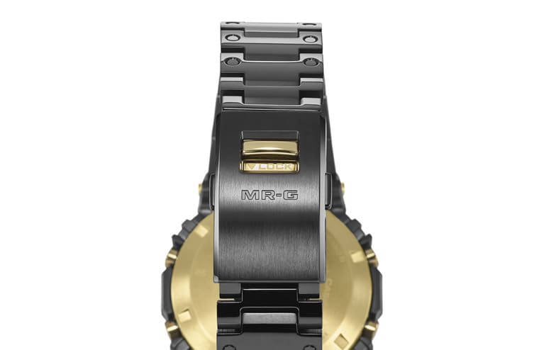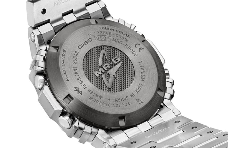 新款MRG-B5000採用的是特殊高級鈦合金材質(Ti64),其硬度為純鈦的兩倍,錶圈則由COBARION®材料製成,硬度為純鈦的四倍,至於鍊帶又是用DAT55G合金製成,其硬度為純鈦的三倍,相對來說比較不容易產生刮痕。雖然三種材質的硬度高,但G-SHOCK也不怕麻煩地仔細將手錶外觀都施以拋光處理後,讓錶殼散發光澤之餘,還保有優異的耐磨性。換成鈦材質還有個好處在於「減重」,比起不鏽鋼錶殼的GMW-B5000的重量(167g),MRG-B5000的重量降至114g,差別還滿大的。系列中的MRG-B5000B施以DLC類鑽碳硬化處理、按把與底蓋則以金色IP電鍍裝飾;另款MRG-B5000D施以碳化鈦Tic表面處理,突顯其髮絲紋理和透亮鏡面外觀的對比感。