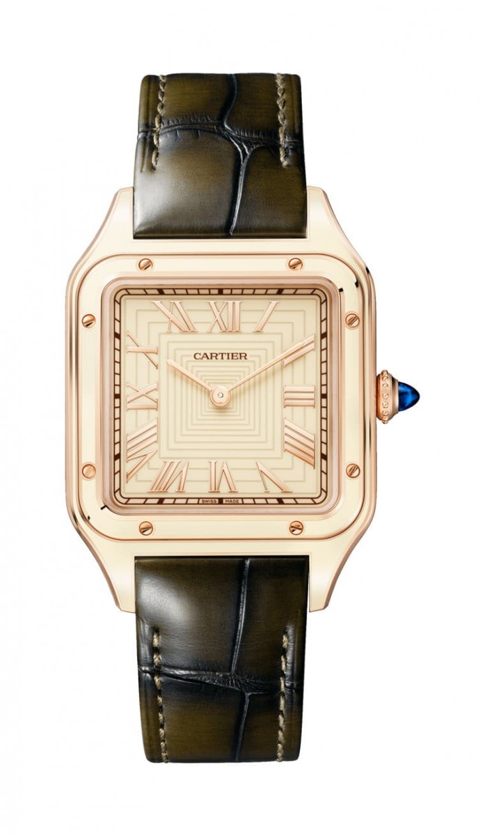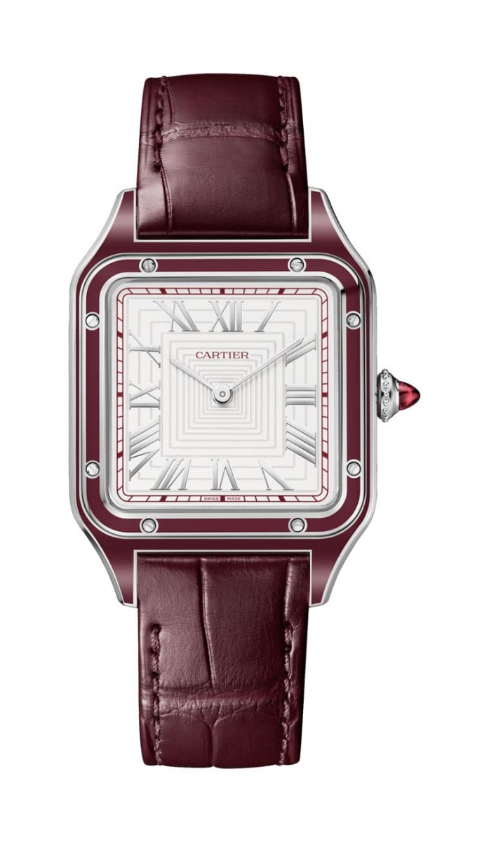 2022年問世的Santos-Dumont系列三款新作都屬於大型款(錶徑43.5x31.4mm),卡地亞分別以鉑金(限量150只)、玫瑰金(限量250只)與精鋼(無限量)打造錶殼,它們依序搭配酒紅色鱷魚皮錶帶、深綠色鱷魚皮錶帶和黑色鱷魚皮錶帶。這三款除了錶殼造型如出一轍,還有個共同特徵在於卡地亞都採用真漆薄層裝飾手錶,如鉑金款以酒紅色真漆塗覆錶殼與錶圈、玫瑰金款採用米色真漆,至於精鋼款則是換上黑色真漆,此外手錶面盤還加上了矩形的放射圖案,如此營造富有視覺魅力的立體感與層次感,搭配系列特色的軌道式刻度與羅馬數字時標,具體而微地再次將Alberto Santos-Dumont選擇配件的三大原則詮釋得淋漓盡致。