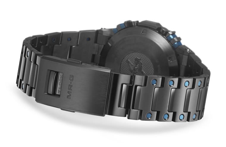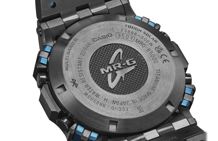MRG-B5000BA-1的鈦金屬錶殼共由25枚零件所組成,手錶的零件由CASIO日本山形廠頂級生產線操刀,除了注重品質,也針對每枚零件各別進行拋光修飾,讓錶殼在不同角度下可以反射出迷人的光澤。此外這款錶的堅實程度也不在話下,G-SHOCK在手錶2、4、8、10點鐘方向的T型零件內加入彈簧墊片吸收衝擊,達到更優異的吸震耐撞性。