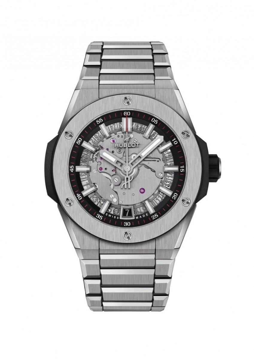 具備基本三針功能的Big Bang Integral Time Only錶徑設定在40mm的適中大小,其錶殼及錶圈與Big Bang Integral系列具有相同特色,如錶圈飾有6顆H型鈦金屬螺絲,強化這款手錶的品牌辨識度,此外錶殼中層融入異材質有助於減緩錶殼側面遭受撞擊時的衝擊力,同時也塑造出手錶正面的層次感。面盤中央露出大片的金屬機板,日期數字環圍繞在面盤外側,並在6點方向開設視窗顯示當天日期,包括時標、指針以及日曆窗邊框,皆與錶殼呼應採用鈦金屬材質,既能展現機械錶迷人的密致構造,佩戴者閱讀時間也能一目了然。手錶面盤延續計時碼錶般的開面設計,露出機芯的機械結構之餘,僅顯現時、分、秒與日期等基本時間資訊,雖不炫目,但是日常佩戴倒也已經綽綽有餘。