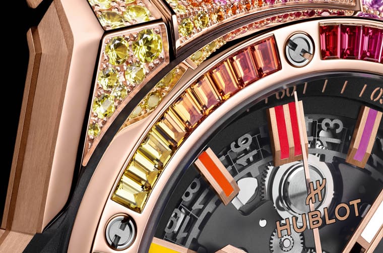 18K皇金材質/HUB1710自動上錬機芯/時、分、秒、日期顯示/錶殼鑲彩色寶石128顆/錶圈鑲長方形切割彩色寶石48顆/鍊帶與錶扣鑲彩色寶石748顆/藍寶石水晶鏡面、透明底蓋/防水100米/錶徑40mm/參考價:NT$ 4,905,000
