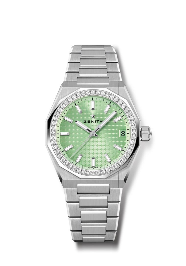 繼2022年後,DEFY Skyline 2023年出現除了41mm的較小尺寸版本——36mm,而且真力時也同步推出了多種面盤配色版本。DEFY Skyline 36mm保留了原作稜角強烈的造型,如刻面不鏽鋼錶殼及十二邊形錶圈等,同時採用中性比例尺寸。新作除了有延續41mm的藍色面盤外,還有淺綠色與粉紅色等兩種面盤新色登場,錶款的面盤鐫刻超有特色、由四芒星組成的幾何圖案,3點方向的日期窗轉盤顏色也刻意選用與面盤一致的顏色,使得手錶看起來更具整體感。DEFY Skyline天際線系列36mm除了鋼殼外,也還有錶圈鑲嵌明亮式切割鑽石的版本,散發更高雅的光芒吸引女性目光。