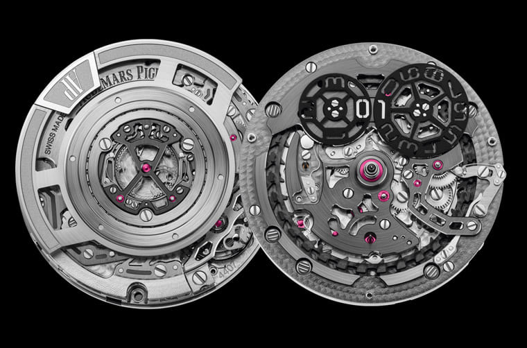 ▲愛彼改良4401機芯加上雙追針等複雜功能模組,為了有效控制機芯厚度,品牌別開生面地將固定追針組件的X形夾板設置在自動盤軸心的水平層面。