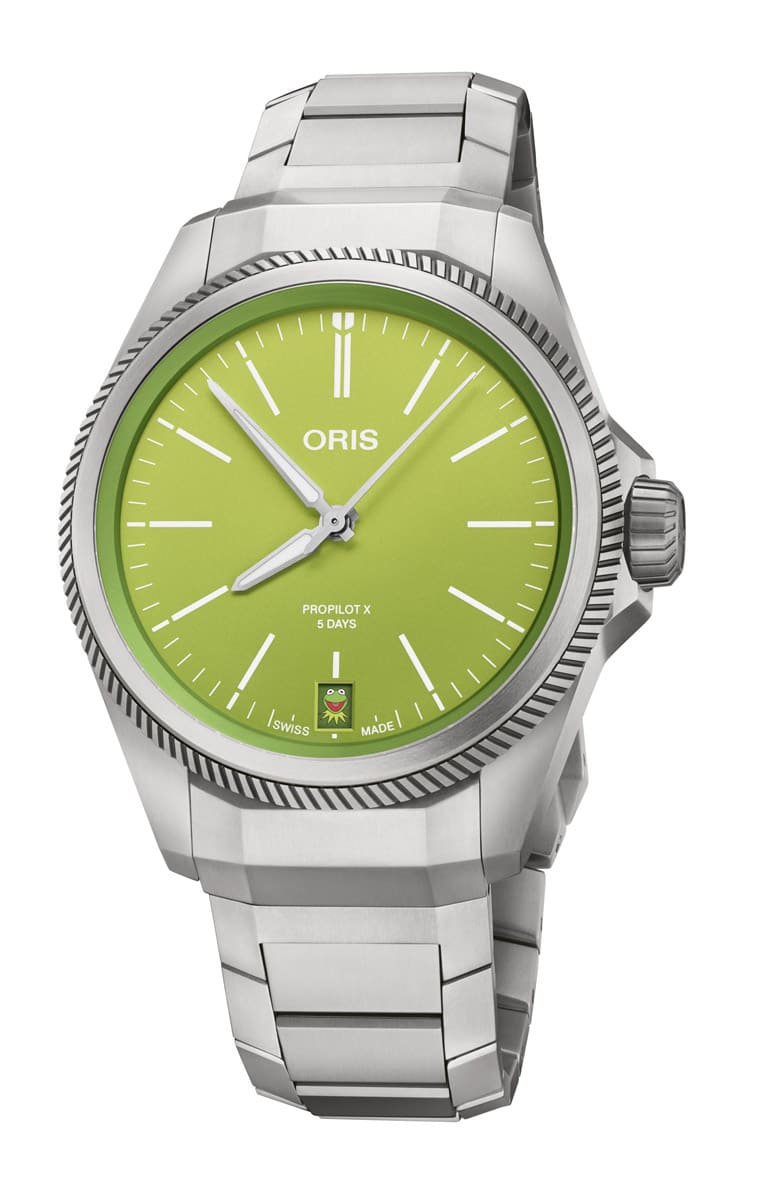 這次ORIS所開發的ProPilot X Kermit聯名錶以ProPilot X Calibre 400為基礎,錶殼與鍊帶都採用鈦合金製成,錶徑39mm大小適中,系列招牌的錢幣紋錶圈也不變,最吸引人的改變莫過於比照科米蛙表皮的綠色面盤,手錶位於6點方向的日期窗有一個ORIS精心準備的彩蛋,每逢每個月的第一天,日期窗並不會出現數字”1”,而是露出掛著招牌笑容的科米蛙圖案,品牌希望手錶帶來的”Kermit Day”能在每個月的開始就讓人有好心情可以應付接下來整個月的挑戰,並不忘帶著幽默感來度過每一天。