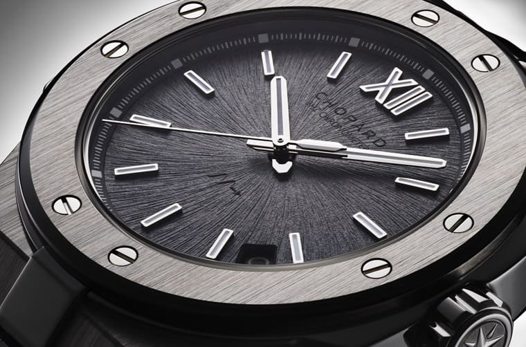 Alpine Eagle系列在初登場時便有灰色面盤版本,Alpine Eagle Cadence 8HF同樣採用灰色調面盤,不過其在細節方面與Lucent Steel A223不鏽鋼有著同中求異的變化。蕭邦這次仍以老鷹虹膜式的裝飾工藝賦予面盤獨特個性,不過Alpine Eagle Cadence 8HF面盤所呈現的Vals Grey暗灰色乃是額外經過陳化處理,使得它的灰色與原本的灰面Alpine Eagle產生微妙的區隔。另外還有比較明顯的改變包括Alpine Eagle Cadence 8HF只留下12點方向設置羅馬數字時標,其他方位則一律改採矩形時標,相對於舊款是在3、6、9與12點位置時標採用羅馬數字是有所調整。
