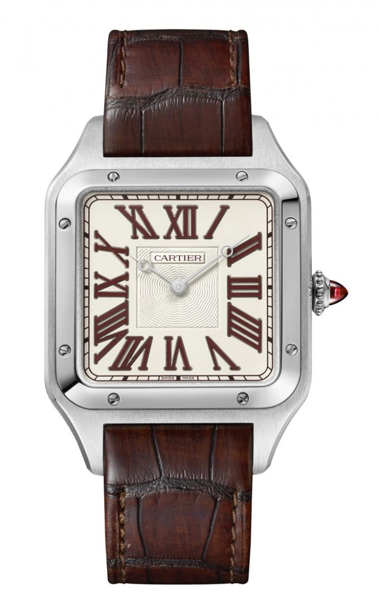Santos-Dumont系列另外推出兩款搭載石英機芯的大型款,一款為不鏽鋼錶殼搭配黃金錶圈,另一款則是黃金錶圈,前者配置的是灰色緞面放射狀太陽紋面盤、後者則是搭配海軍藍色緞面放射狀太陽紋面盤,包括錶帶也都與面盤同色調,至於面盤上的羅馬數字時標以及指針都是金色系,展現與Santos陽光豪邁風格有別的雋永雅緻風格。