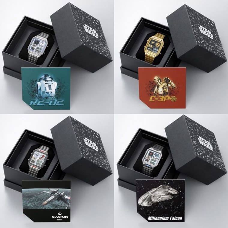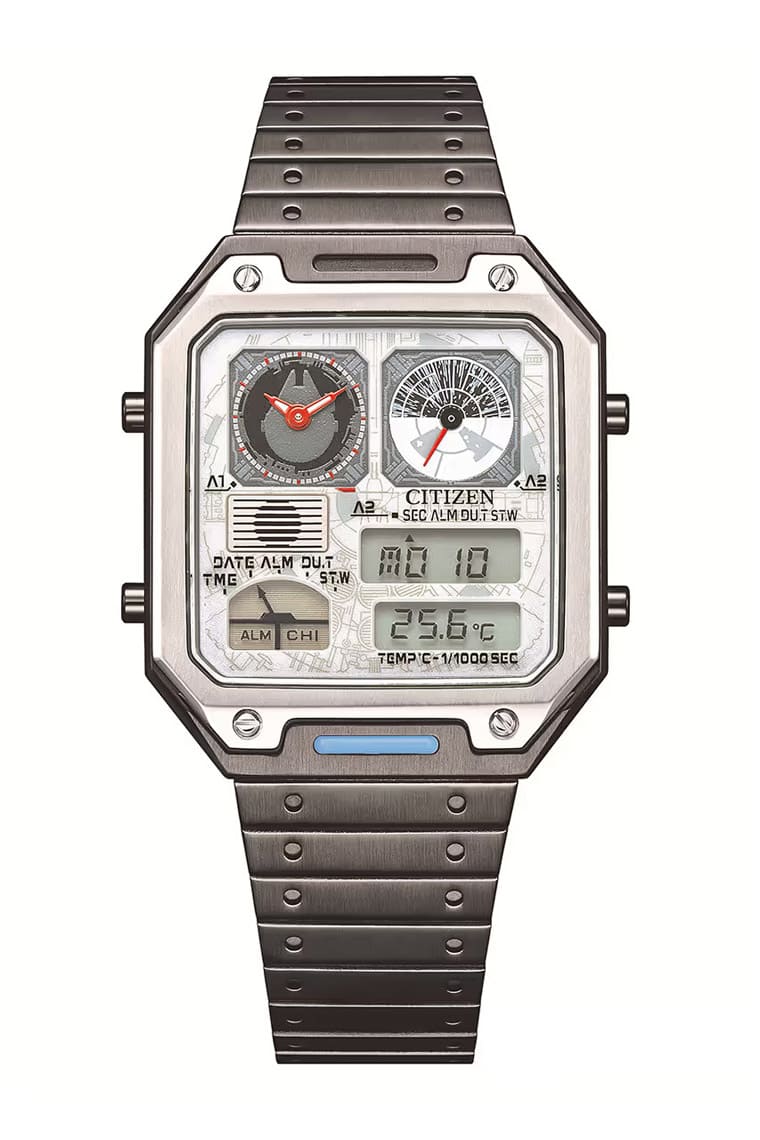 Thermo Sensor為CITIZEN 1982年打造的作品,它是史上首款具備溫度計功能的指針/數位雙顯手錶,近年品牌重新復刻這款錶後頗受市場喜愛,因此2023年的星際大戰聯名錶再度奠基於此系列,並精選出星戰電影的人氣角色如R2-D2、C-3PO、X翼戰機和千年鷹號作為手錶的創作主題。Thermo Sensor雖然是1980年代的產物,但是它的設計放到今天來看還是頗為前衛,手錶面盤繁複的顯時資訊以及分隔設計剛好給了CITIZEN寬闊的設計空間,足以將四種主題完整地放進手錶正反面。這個限量系列手錶都會有特別製作的錶盒,裡面還會附上聯名角色的卡片供錶主珍藏,以下就來一一揭曉新出的四款作品有何特色。