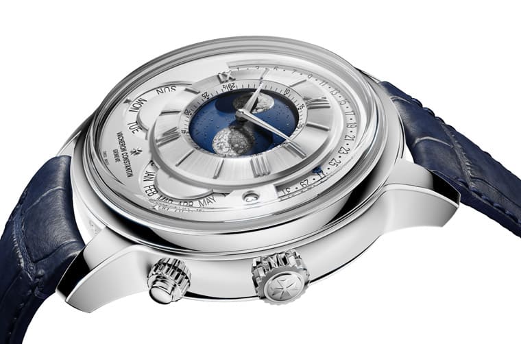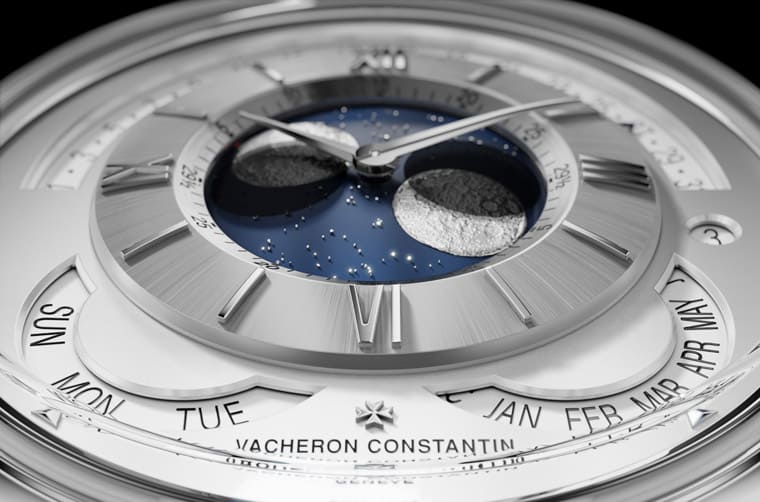 月球圖案是以鈦金屬製成,表面逼真做出凹凹凸凸的隕石坑造型,至於轉盤的藍色背景經過PVD處理,據說江詩丹頓用了九道工序才造就出媲美夜空的深邃藍色。月球圖案每59天12小時45分旋轉一圈,搭配時標環內緣的1至29½刻度呈現明確的月齡資訊,經過精密計算的月相盤齒輪,能使雙月相顯示每122年16天才會產生一日誤差,和萬年曆功能的顯時便利性有著相輔相成的作用。