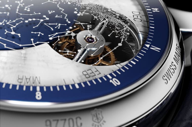 手錶背面還有驚喜,第一眼會看到錶背壯觀的星空圖,周圍的藍色刻度則是用以顯示恆星時資訊——由於地 球會同時自轉和公轉,在以固定恆星為參照標準的情況下,恆星日比一個日曆日平均少約4分鐘,也就是一天的週期大概是23小時56分4秒,其與手錶正面的日曆日時間差異於錶背便可一覽無遺。錶背上層的可移動圓盤以恆星時為基準旋轉,當手錶朝向北方時,圓盤中的星座圖案映射在下層固定顯示盤中的位置,就是代表當下投影在地平圈內的星座即時方位,想要觀星不一定要看老天爺臉色,Les Cabinotiers閣樓工匠雙月超卓複雜功能手錶也具有這種猶如腕上微型宇宙的功效。