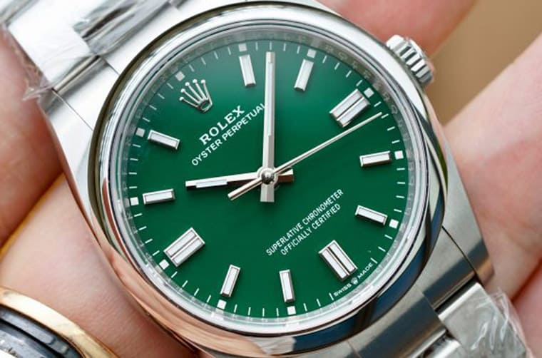 Oyster Perpetual的錶耳帶有略往邊緣垂下的弧線,佩戴在手上可以更貼合手腕曲線,另外拋光錶圈幾乎就順著錶殼邊緣成形,這能讓手錶面盤看起來簡潔卻從容。目前36mm的Oyster Perpetual只有幾何型時標可選,但是相對來說面盤顏色既有彩色漆面、電鍍太陽放射紋面盤,甚至還有2023年新增加的彩色氣泡面盤款式等,替這款中規中矩的三針錶帶來視覺上的誘因。其中漆面款式的彩色顯得相對飽和,以前我們可能會覺得缺乏變化性的單色調看起來可能會有點乏味,可是勞力士直接用漆面的質感說服市場接受單色調也可以簡單得很好看。