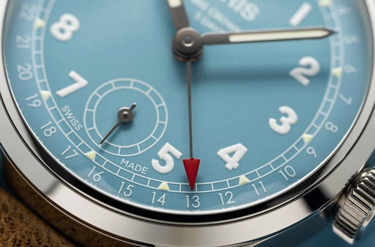 Big Crown Calibre 473採用不鏽鋼材質製作38mm的錶殼,並搭配橄欖棕色的Cervo Volante永續鹿皮錶帶(因此錶帶內側則會印上甲蟲圖案),Big Crown系列為品牌1930年代開始廣受市場注目的主力作品,此次導入Calibre 473後,使得系列在過去好幾十年來第一次搭載品牌自製的手動上鍊機芯! 錶款面盤以藍色系示人,面盤外圍設有日期刻度、6點方向則有小秒盤,其中日期刻度與面盤一枚紅色箭頭指針配合發揮作用,而包括刻度、時標等皆為白色,在藍色面盤的烘托下讓人能夠清楚讀時。面盤格局基本上與大錶冠系列具有同樣功能的作品如出一轍,由於系列先前也已經推出過搭載Calibre 403機芯的款式,因此就連12點鐘方向極具辨識度、象徵長效動能的"5 DYAS"字樣,也已經不是首度出現在Big Crown指針式日期手錶上。