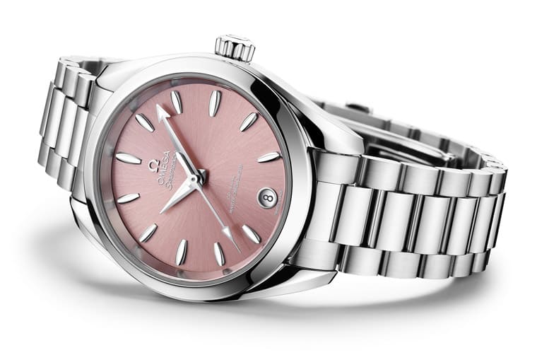 歐米茄前陣子打造的海馬Aqua Terra新作在秉承系列外觀造型、性能與機能等特色之餘,最大賣點就在於面盤顏色,而且這次品牌沒有針對面盤裝飾工藝多加其他視覺可感的明顯紋路或設計,純粹靠著「色彩」賦予整只錶同中求異的自我個性,而且Seamaster Aqua Terra Shades還一口氣出現38mm與34mm兩種尺寸,基本上手錶的規格都是不鏽鋼錶殼搭配鍊帶的組合、甚至機芯也是同一枚,但是兩種尺寸在面盤細節以及用色方面還是有些區隔,例如「貝殼粉」就是34mm專屬的色調。