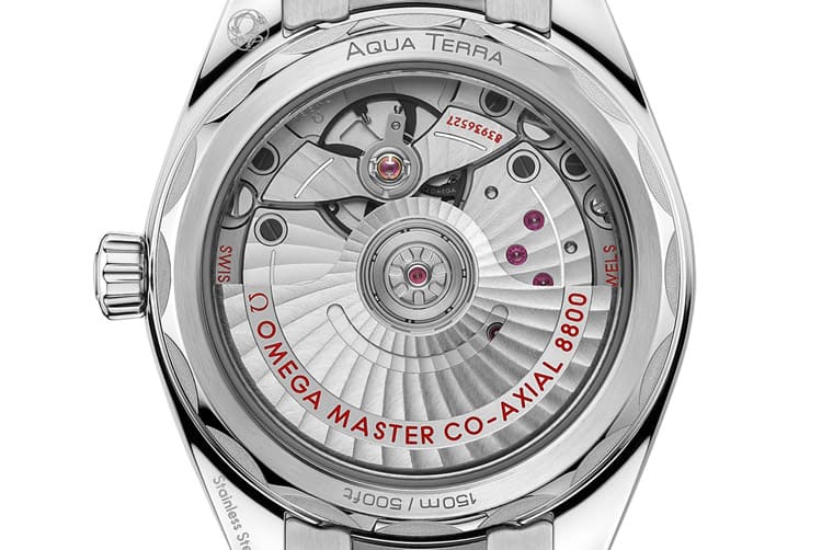 Aqua Terra Shades 34mm錶背為透明底蓋設計,露出手錶搭載的8800大師天文台認證機芯,這枚機芯的自動盤與底板飾有阿拉伯式日內瓦波紋,在橫跨式橋板下方的擒縱系統可見矽游絲,結合歐米茄以非鐵材質製作的其他機芯零件,使其抗磁性能經過實驗測試能達到高於15,000高斯的超強悍境界,有效降低機械錶天敵——磁力可能對手錶造成的負面影響,加上8800機芯的動力儲存也達55小時,平常每天都戴錶習慣的話,就不需要太擔心動能的問題,因為白天靠著手腕擺動帶動機芯上鍊所轉化的動能,續航力足以支撐到隔天出門再次佩戴時綽綽有餘。
