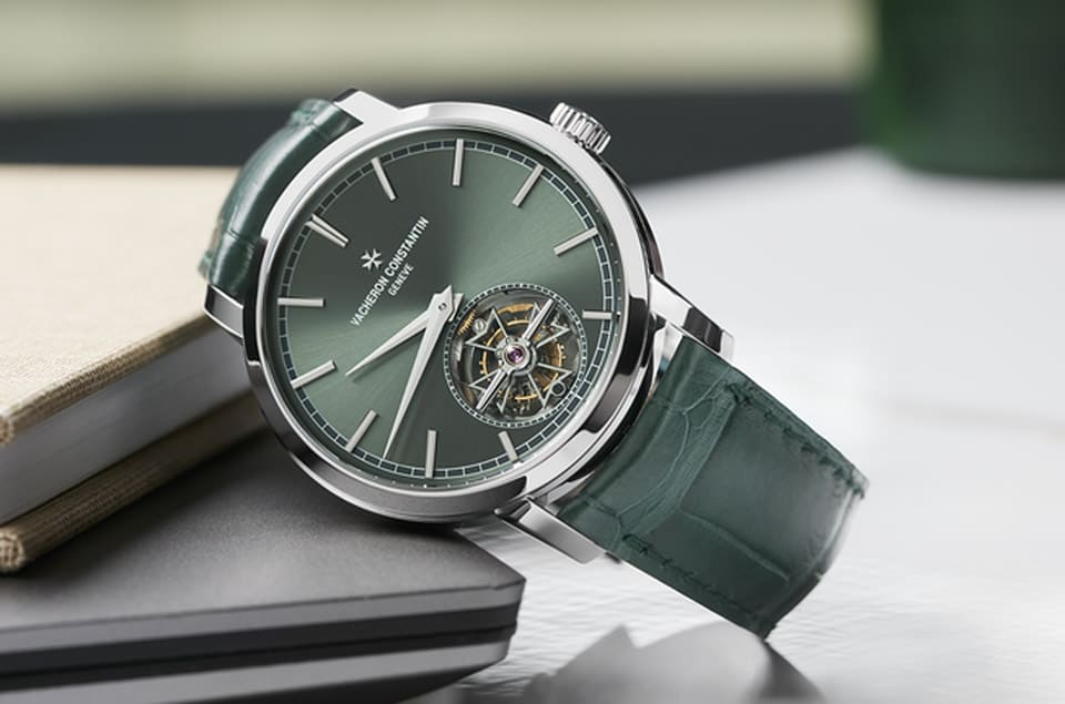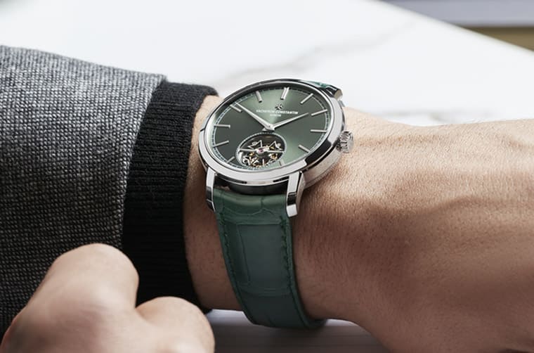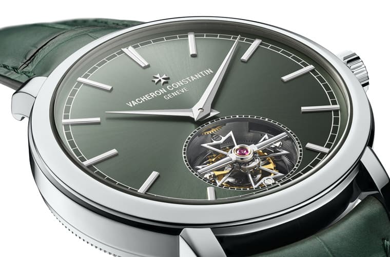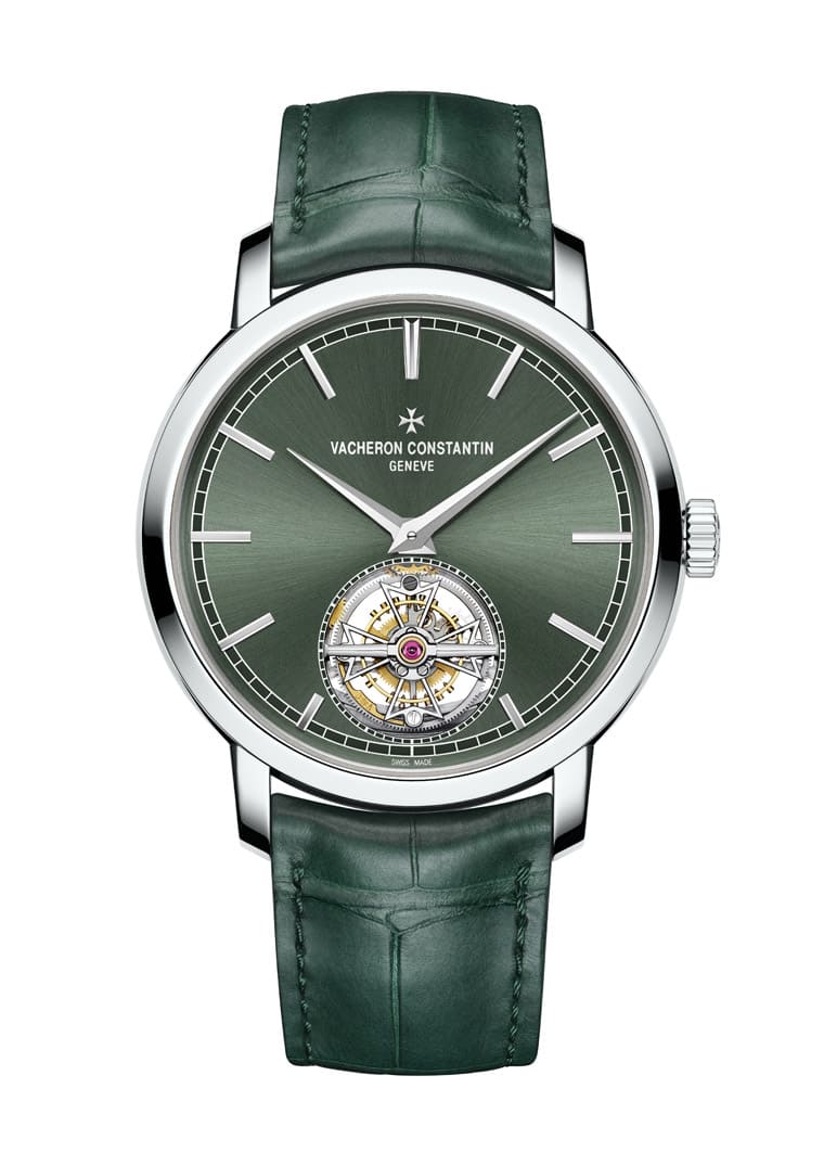江詩丹頓的Traditionnelle自動陀飛輪原本在品牌官網上只剩玫瑰金銀面款這種經典不敗的設計,另外還有兩款限量的龍鳳金雕陀飛輪版本(銀面與黑面),等於一般版和限量版之間的(裝飾工藝和定價)差距有點落差,相對之下一般版的選擇很少,因此品牌又在2023年追加了錶殼採用更高檔鉑金的新作,藉以補上既有款式間的空白。這款Traditionnelle自動陀飛輪不只錶殼材質升等,就連整體的配色也有大膽突破,它成為系列線上款式中唯一的綠色調作品,耳目一新的設計頗為吸睛。