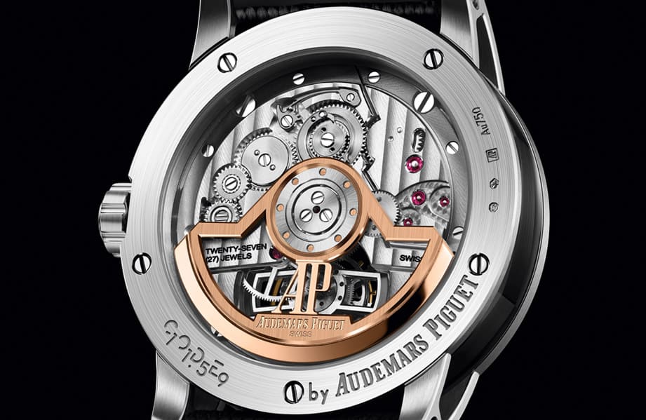 透明底蓋下可見愛彼自製2950自動上鍊機芯,這枚機芯動力儲存達65小時。四年前剛現身時它可是是愛彼首次在自動上鍊機芯中融入中央自動盤與飛行陀飛輪等特徵的研發結晶。機芯零件具有高端精修向來是愛彼時計的精髓所在,機芯上的高複雜精修工藝如緞面拉絲、倒角與拋光等處理手法,都能使錶款外觀更加出眾,機芯的底蓋一側飾有日內瓦波紋、蝸形紋以及手工拋光倒角斜面,可從底蓋透視的鏤空自動盤乃是玫瑰金材質,在銀白色調的大多數機芯零件中顯得一枝獨秀,在經過這幾年的發展後,目前CODE 11.59系列的鏤空自動盤造型也經過品牌微調,接近軸心處多了折角線條,而且延伸至外緣處還多了切角處理,使機芯線條看起來更繁複精緻些。