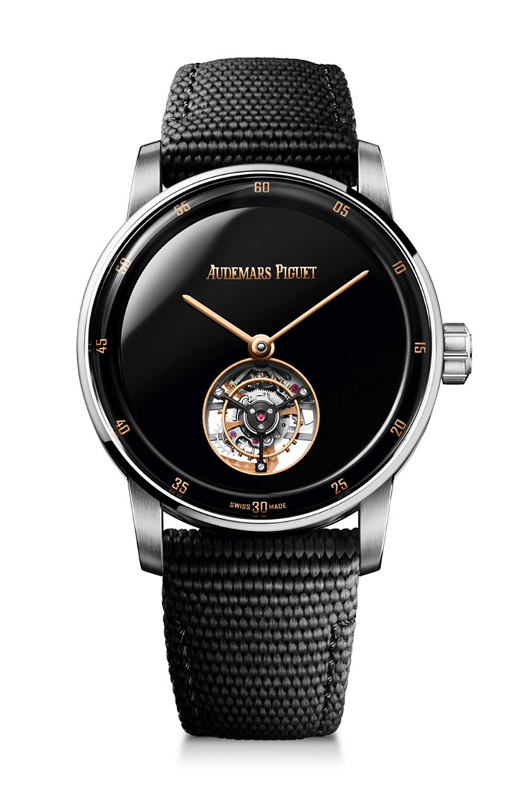愛彼的CODE 11.59系列剛出道時就已經可見飛行陀飛輪作品,四年過去後此系列還是保有蘊含此種功能的作品,只不過最初的款式已經停產,取而代之是後來陸續登場的CODE 11.59自動飛行陀飛輪。想當初CODE 11.59剛問世時,系列一律都採用貴金屬製作錶殼,不過近年愛彼逐漸導入其他材質,甚至還利用錶殼的獨特造型衍生出異材質的組合,例如這款CODE 11.59自動飛行陀飛輪便是結合白金與陶瓷材質,當從側面角度欣賞手錶時,便能窺見它不同於一般金屬錶殼的色彩層次。