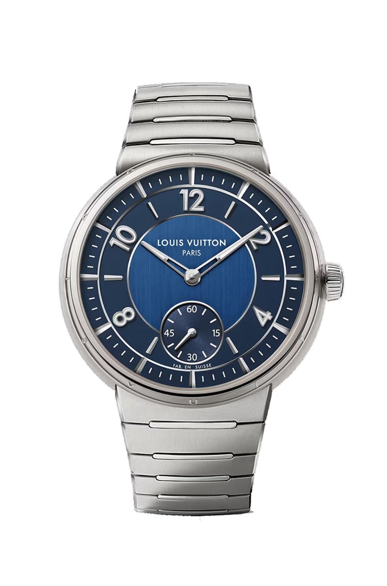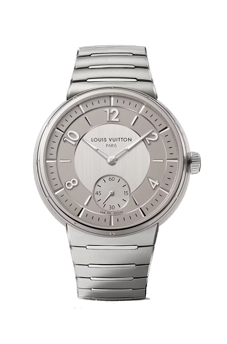 融合巴黎時代風尚與瑞士製錶技術的Tambour不鏽鋼自動小三針腕錶,直徑40mm、厚度8.3 mm,整體以拉絲飾面裝飾圓形錶殼,噴砂錶圈加上拋光邊緣增加層次。錶殼側面也就是最重要的弧形側面,在與小時標記對齊處,刻上LOUIS VUITTON品牌12個字母,在清晰精準之餘,表現了Tambour腕錶系列不敗的中性設計。不僅如此,此錶還有另一個首創,是路易威登第一款採用整合式錶帶的腕錶,與整體採用拉絲飾面的錶殼相同,也使用拉絲不鏽鋼錶鍊,事實上是以多個拉絲鍊節組成,彷彿一體成型,而且鍊帶鍊節的上下表面均為凸面,形成連貫的圓形線條更能緊密舒適地貼合整個手腕。鍊節末端刻有 LOUIS VUITTON 字樣,並搭配三片式折疊扣的隱藏式開口,極其簡約。加上無錶帶頭的結構,錶鍊與錶殼更是無縫融合,加強堅固性和靈活性的佩戴感受。