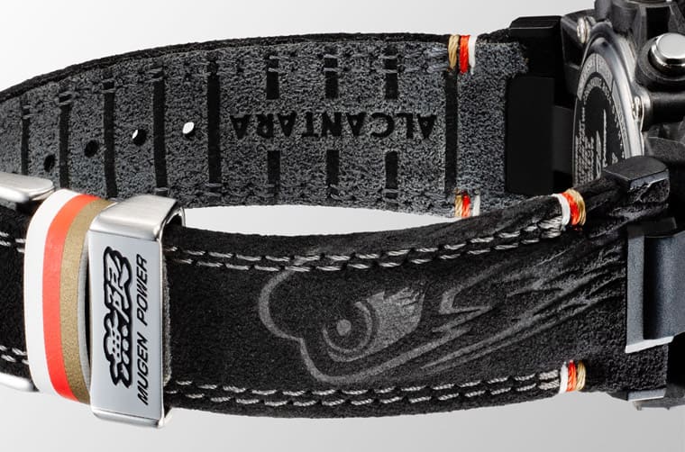 ▲表带选用与MUGEN赛车座椅相同的Alcantara麂皮材质,表面还加上MUGEN POWER和Eye Commander图样压纹,搭配皮革和金属制成的双重表带扣环,质感别具。
