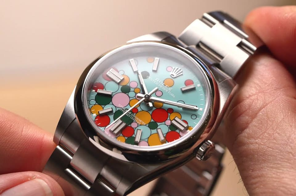 彩色氣泡面盤OP加入了多種顏色的漆料後,猶如TIFFANY藍面OP的彩色升級版,剛好近年高級錶市場對這種色彩飽滿的設計非常有愛,所以在這個熱門錶身價普遍往下墜的時代,彩色氣泡面盤OP行情還真的有點像面盤的泡泡一般直接騰空飛了起來,逆風高飛的表現讓人驚呆。