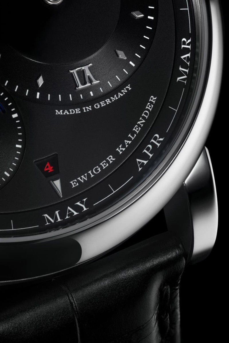 ▲月份資訊以朗格自家開發的外圈跳字月份環呈現,設計簡潔易懂,並能保持面盤的俐落格局。