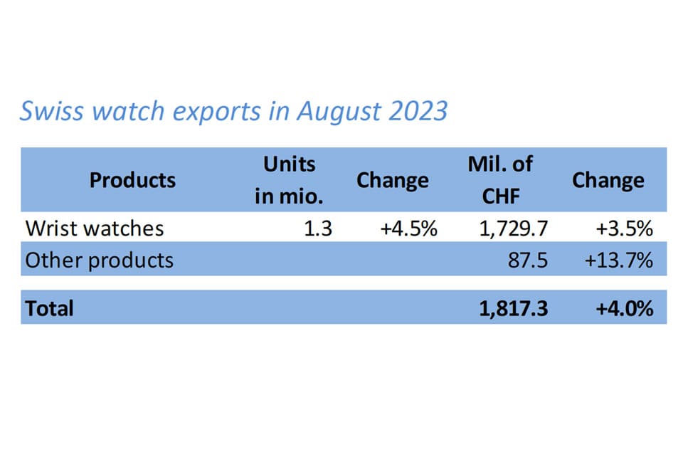 《彭博社》引述瑞士鐘錶工業聯合會(FH)最新公佈的資料,瑞士手錶2023年8月的出口額比2022年同期成長了4%,達到18億多瑞郎的程度,且瑞士手錶在該月份前六大的出口市場中就有五個國家或地區呈現正成長,光是這五國便佔瑞士手錶整體出口額比例的55.4%之多,其中美國市場還是至關重要,因為2023年8月他們的出口額增長13.5%,具體數字則是2.987億瑞郎。