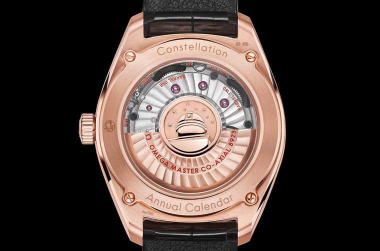 雖然歐米茄不是第一個用指針顯示月份的品牌,不過OMEGA跟其他家最大的不同在於其他的品牌往往都是直接用時標權充月份,但Constellation Globemaster年年曆錶反而是利用時標跟時標之間的空間印上草寫的月份字樣。用時標借代月份的好處在於直覺易讀,因為5點鐘就是代表五月,不需要多加思索,因此其他品牌採用這種設計的手錶都沒有在時標旁另行標注月份,相對地OMEGA的設計如果沒有額外印上月份名稱就比較容易造成判讀時的混淆,可是一旦習慣了這樣的顯時模式,加上月份指針又都是停在時標與時標中間,會造成誤判情況的機率也不高就是了。錶款搭載的8923自動機芯與不鏽鋼款式搭載的8922機芯差別在於前者自動盤也是用Sedna™金製成,其他機芯零件的打磨與規格則無二致,紮實好用是這系列年曆機芯的普遍印象。