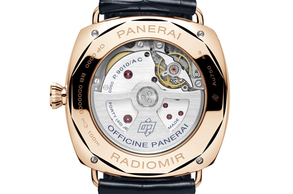Radiomir Annual Calendar錶背的透明底蓋下方可見沛納海新研發的P.9010/AC自動機芯,它的動力儲存維持品牌標準的3日錬,可見即使功能進階至年曆等級,沛納海還是很注重實用性層面。這枚機芯中的年曆機制中設有一枚凸輪,每到月底時會自動推進面盤外圍的月份刻度順時針轉動一格,而且它還能區辨大小月之分,也就是可以辨識每個月底為30日還是31日,但是在每年的2月底時因為天數只有28天或29天,因此凸輪沒辦法區隔這種更細膩的日曆週期變化,只能靠佩戴者自行手動調校,但比起一般日曆功能手錶已經方便很多。P.9010/AC機芯在錶殼8點方向設有隱藏式按把,可以讓佩戴者快速調校星期顯示,與手錶外觀的簡潔感互相輝映,講究的設計讓人對這款錶愈玩味愈有好感。