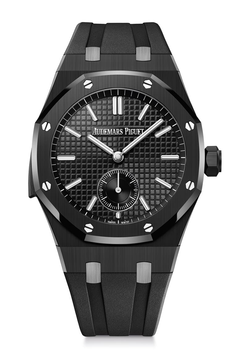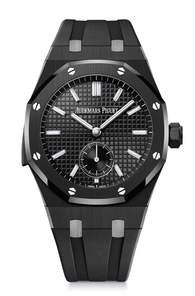 錶款的面盤擁有皇家橡樹系列招牌Grande Tapisserie大型格紋裝飾,面盤周圍鑲有白金立體琢面時標,而且時標和指針的表面都塗上夜光物料讓佩戴者在光線不足的情況下還是可以清楚辨識當前時刻。面盤6點方向設有小秒盤,從中呈現時間流逝的即使感,而且愛彼這次同步推出了兩款黑色陶瓷皇家橡樹超問錶,兩者的差別在於一款時標為白金、另一款則改鑲矩形切割鑽石,在低調的全黑外觀下衍生額外的華麗感。