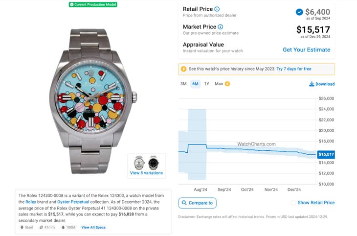 不過OP彩色漆面並非五種尺寸五色都有,僅31、36和41mm有彩色漆面的待遇,而且其中也只有36mm五色齊全,其他兩種尺寸都分別少了一個顏色,加上2022年後勞力士又大舉減少彩色漆面的款式,例如41mm就被砍到只剩下綠色一種顏色,市場的選擇頓時少了許多。2023年品牌再端出「慶典」(Celebration)面盤圖案,也就是錶迷口中的「彩色氣泡面」,又再把人們的注意力拉回這個系列上。目前Oyster Perpetual系列男性優先追求的41mm款式定價如下: