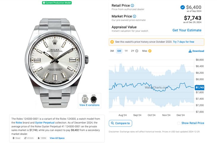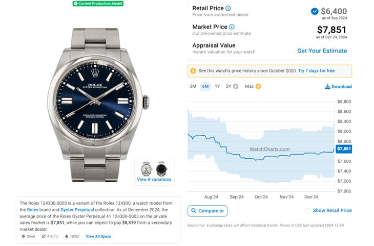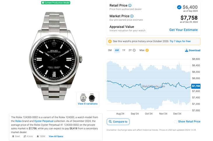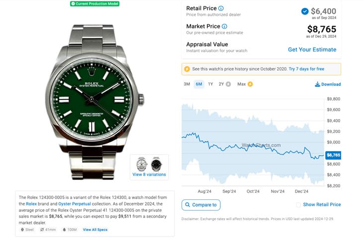 銀面和黑面OP在過去一個月來呈現短期內較大的起伏,藍面在2024年10月跌到今年谷底後,最近兩個月反而都有稍微回升一些,倒是前述的彩色氣泡面在2024年7月迎來大爆發令人驚豔,只是高峰沒維持太久又跌了下去;至於綠色漆面最近一個月內還是持續走跌,價格創下2024年來的新低。然而受到前三年OP系列爆紅的影響,現在這幾款手錶的行情都還處在超定價範圍,溢價率由高到低依序是彩色氣泡面的142.4%%、綠色漆面的37%、藍面的22.6%、黑面21.2%和銀面的21%,大致而言還是循著彩色漆面熱潮的態勢發展。OP系列這款勞力士入門款行情在這幾年間的確有所提升,此為值得注意的現象,這讓OP不再像以前那麼波瀾不驚,而是能夠牽動錶迷注意力的重要款式之一。