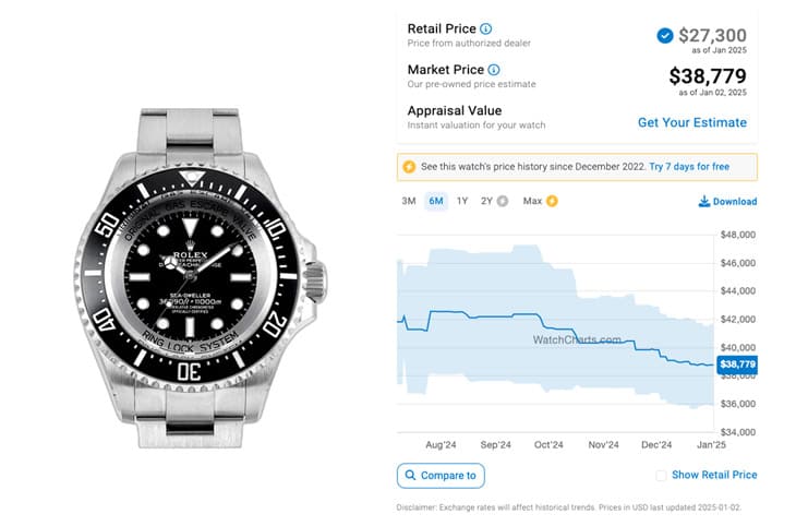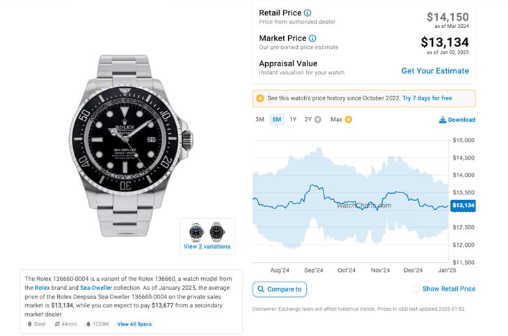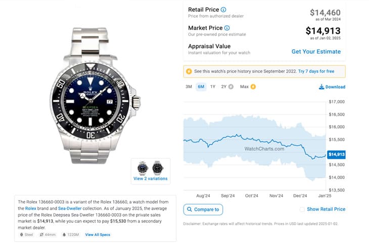 Deepsea從2022年第1季的熱門錶二級市場價格爆衝後馬上開始撞牆,到2025年後這種價格走跌的情況還是持續進行中,根據高級手錶市場調查研究機構WatchCharts的資料,此系列三款錶在2024年7月時於國外二級市場的報價分別是136660 D-Blue的15,447美金(約合台幣51萬)、黑面的13,339美金(約合台幣44萬),以及Deepsea Challenge的41,831美金(約合台幣138萬),其中後者還滿令人驚訝的,當你覺得它不好戴、定價又偏高時,收藏家們反而趨之若鶩想搶這款錶,連帶把它的行情推高,至於D-Blue則是保持在小幅的超定價程度(黑面這時早就已經跌到定價以內),行情看似相對合理些。
