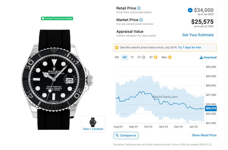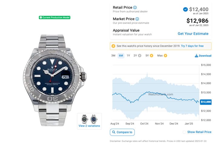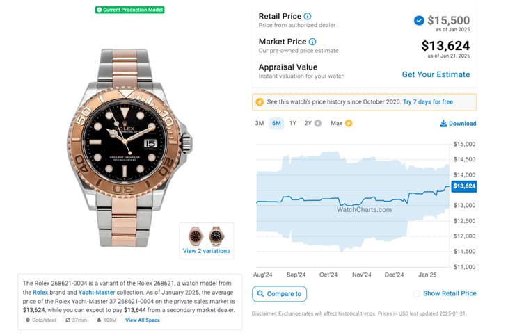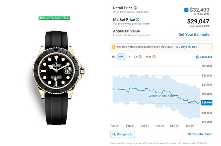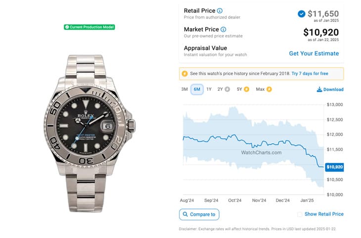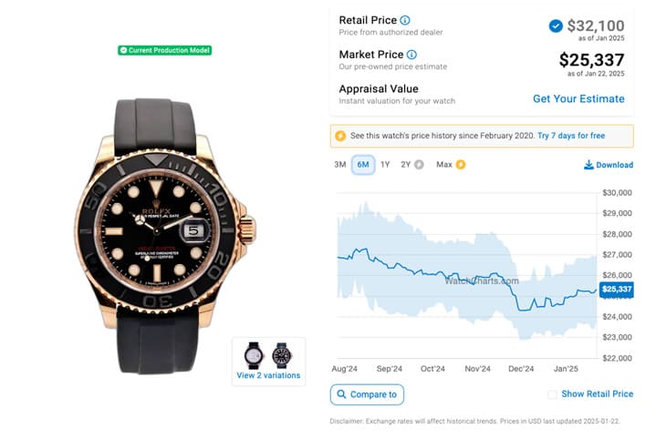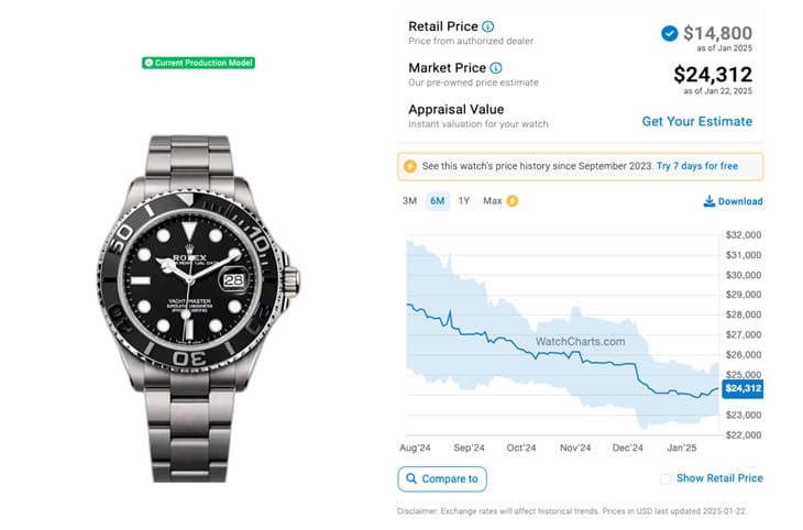 目前遊艇系列的入門款定價已經超過台幣40萬,貴金屬款式價位超過百萬的也逐漸增多,不過遊艇相較勞力士其他熱門系列的表現並沒有這麼強勢,尤其經過2022年第2季以後高級手錶市場價格全面下滑至今的影響,現在遊艇系列各款錶的二級市場價格大致也都在往下走。