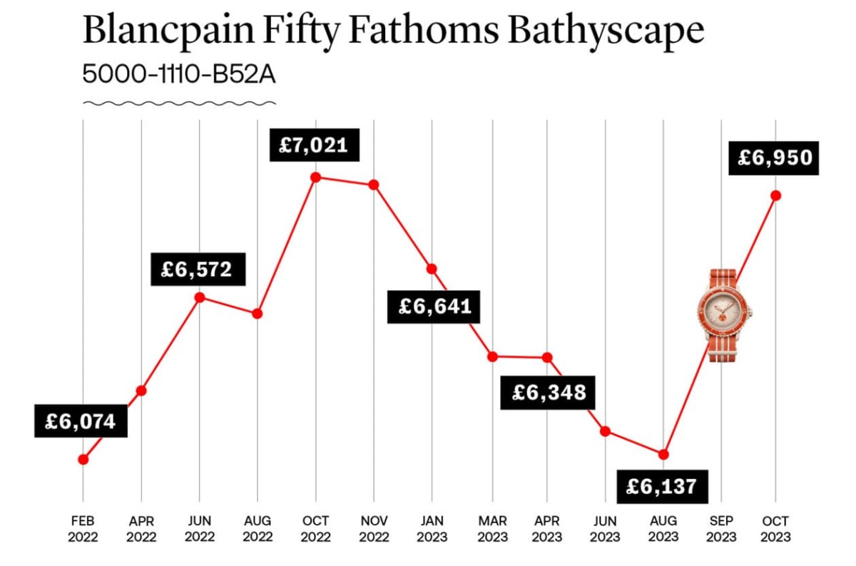 根據英國知名手錶交易平台Subdial的觀察,以寶珀Fifty Fathoms五十噚的長賣型號Bathyscaphe 5000-1110-B52A為例,這款錶在SWATCH x BLANCPAIN Bioceramic Scuba Fifty Fathoms推出後的一個月,其在英國二級市場的平均報價從6,137英鎊(約合台幣24萬1)上漲至6,950英鎊(約合台幣27萬3),漲幅達到15%。