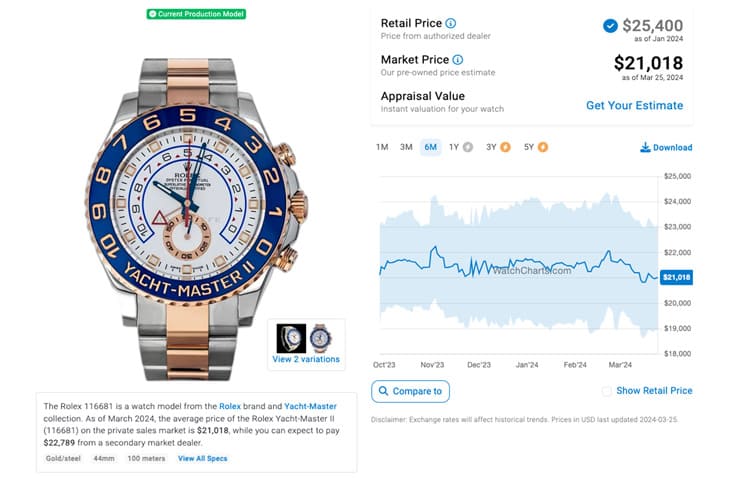 一般来说大家比较少讨论Yacht-Master II,可能因为它的入手门槛高、追求者比起水鬼、Daytona等大热门系列也少很多,所以我们比较少关注到它的行情发展。根据高级手表市场调查研究机构WatchCharts的资料,游艇2从2022年第2季到现在,手表的二级市场价格也还是呈现缓缓下降的趋势,其中116680在2023年9月底左右的行情还有17,308美金(约合台币55万2)、116681为21,118美金(约合台币67万4),116688则是40,251美金(约合台币128万4),在距今半年前的时间点,三款表二级市场价格纷纷都已经落在定价以内,因此Yacht-Master II的行情算满早就开始跌破定价线,而且还一路持续到现在。
