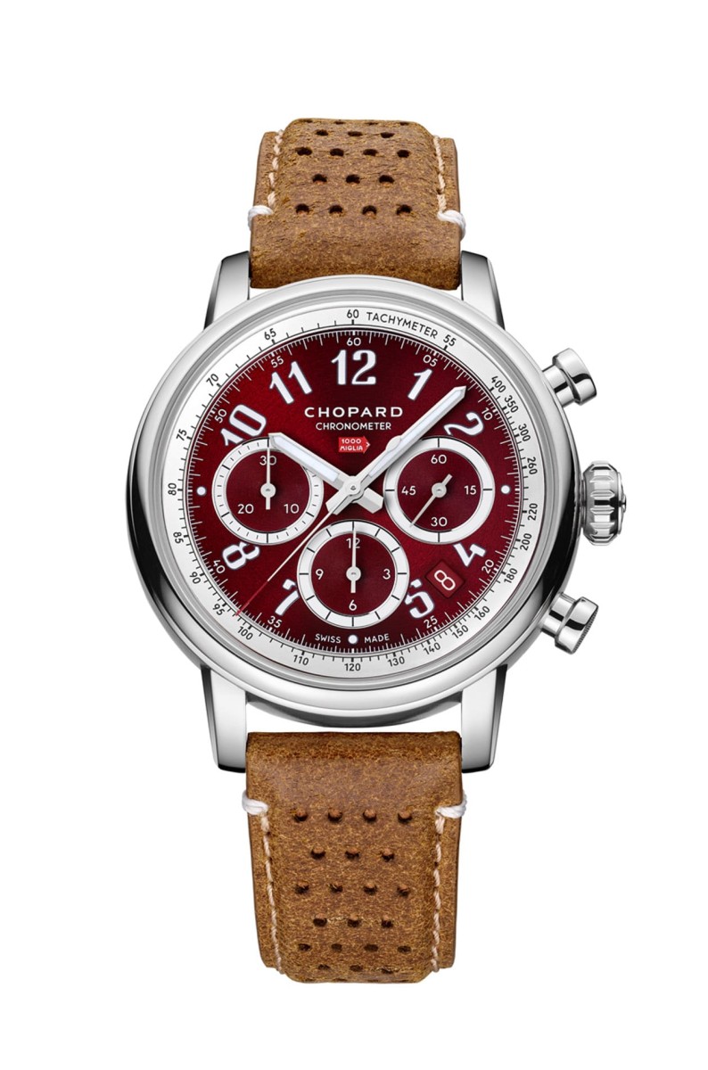 腕錶中央計時大秒針的針尖帶有紅色塗層,用意在於和12點方向的紅色1000 Miglia標誌共同呼應Mille Miglia一千英里古董車賽淵源,同時也能讓佩戴者在判讀計時結果時更加一目瞭然。