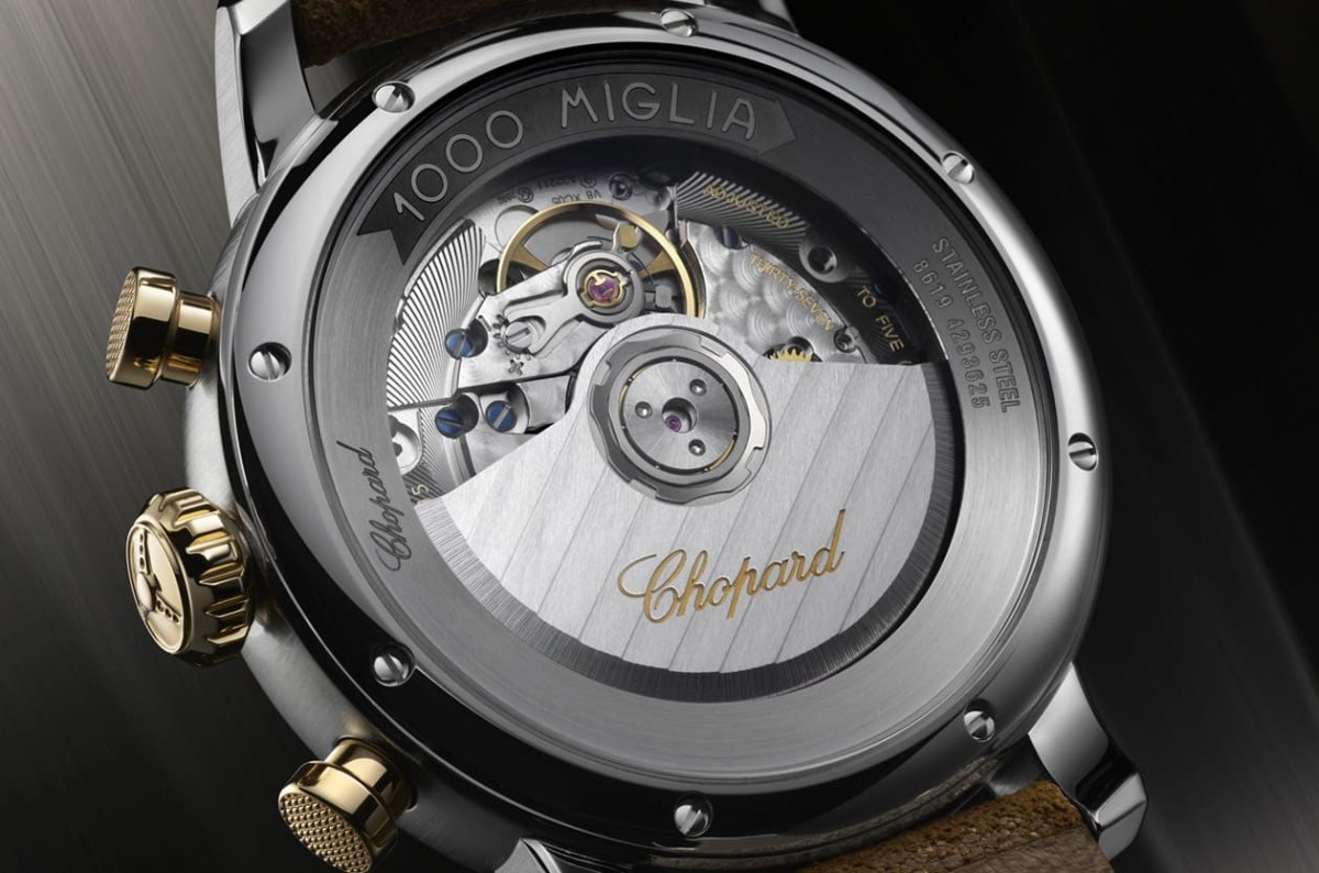 新款Mille Miglia Classic計時碼錶換成透明底蓋大方露出腕錶內部搭載的機芯,從面盤格局可推知去年與今年款式搭載的機芯並不一致。錶背可先一窺12點方向的”1000 Miglia”字樣,另外左右兩邊各別刻上蕭邦標誌以及底蓋周圍材質與編號等資訊,新款Mille Miglia Classic計時碼錶不像2022年款式由於採實底蓋設計因此還能將車賽主要行經路線標示於其上,但佩戴者也因此擁有能夠細細品味機芯結構的視野。這枚機芯的自動盤以日內瓦波紋點綴、底板飾有團花紋,而夾板也還有環形放射紋展現品牌一絲不苟的工藝水準。而機芯規格如震頻28,800次/小時以及54小時動力儲存等,都出自針對賽車手實用需求而設,在精準度方面經過COSC瑞士天文台認證,確保腕錶品質與外在質感等量齊觀。
