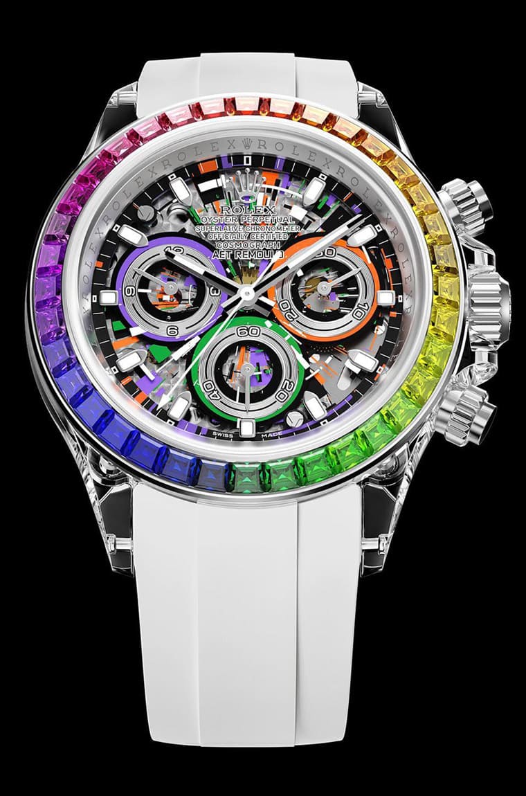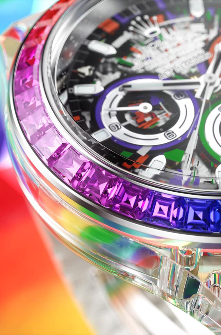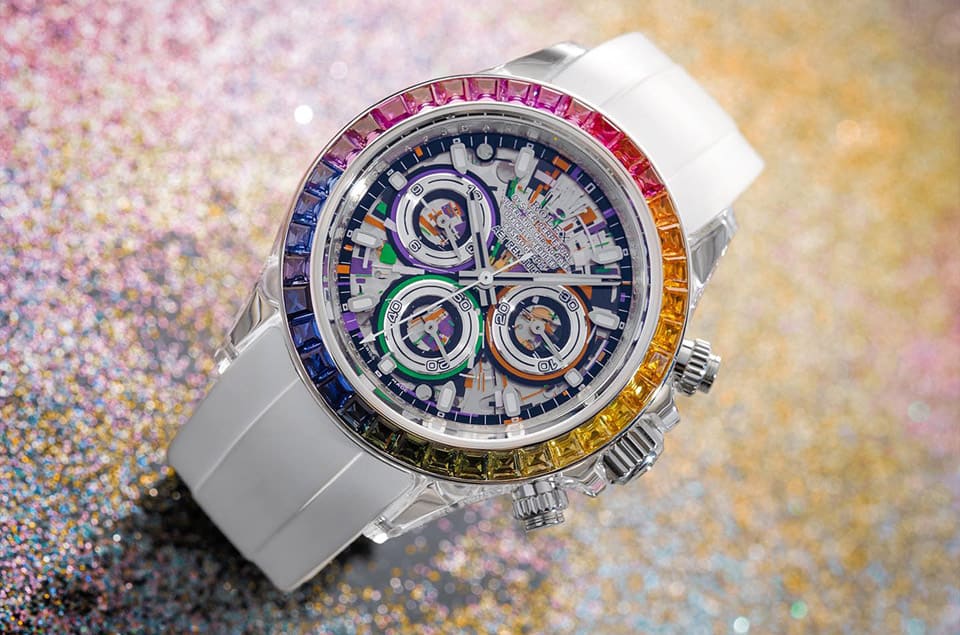 錶款在改裝錶品牌經驗豐富的寶石鑲嵌工藝團隊努力下,成就美不勝收的彩虹圈成果。錶圈上的每顆彩色寶石都精確地對準其所屬位置。從尺寸、厚度到切割角度,每顆寶石都遵循嚴格的標準製作而成,目的是要讓它們可以發揮最大的光澤並展現本身的迷人色彩。